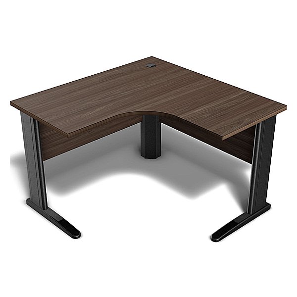 Mesa em formato “L”, tampo de 25 mm de espessura e acabamento em fita 2 mm, travessa 18 mm de espessura com 400 mm de altura e acabamento com fita 1mm, pés de aço